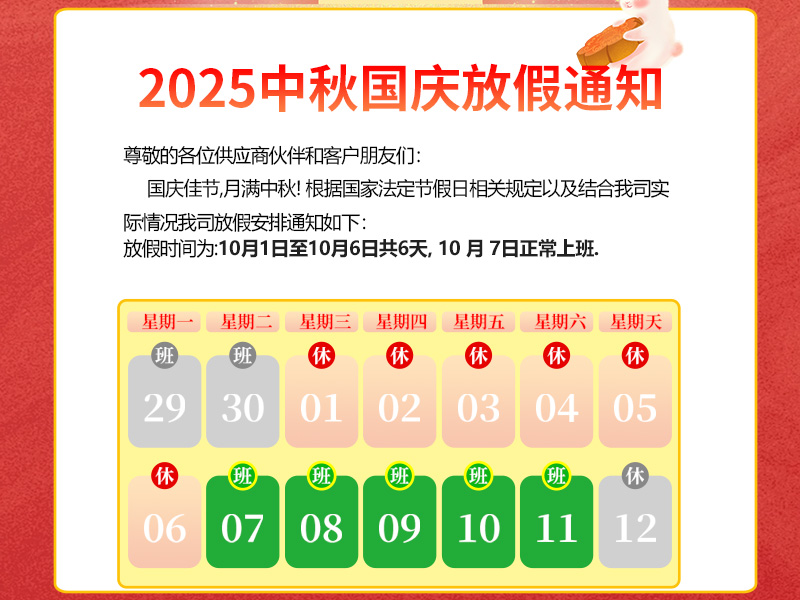 尊敬的各位供應商伙伴和客戶朋友們:國慶佳節,月滿中秋!國慶家園月圓人團園,國慶中秋雙節共歡騰!在此預祝大家度過一個輕松、愉快的假期.根據國家法定節假日相關規定,再結合我司實際情況,現將2025年國慶中秋節放假安排通知如下:放假時間定為10月1日至10月6日(星期三至星期一),共計6天.2025年 10月 7日(星期二)正式上班,假日期間如有業務需求可電話咨詢業務,感謝大家的理解與配合!秋高氣爽迎中